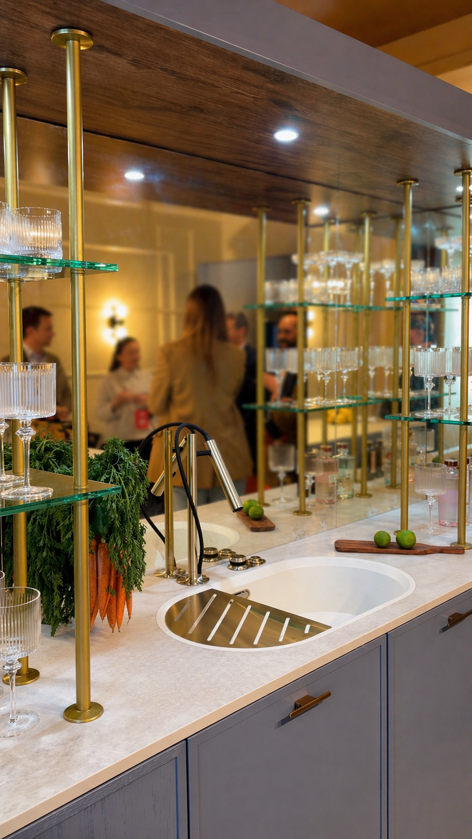 O conjunto completa-se com a torneira LUNEO em Satin Gold e a placa de cocção invisível NOVY Undercover, uma solução que fica totalmente oculta na bancada e reforça a limpeza visual do projeto.